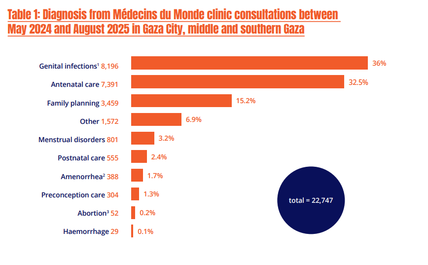 - Of 22,747 sexual and reproductive health consultations conducted at Doctors of the World health centers in Gaza, 36% were for genital infections linked to lack of water and hygiene, and the high cost of menstrual products (at least $15 for a basic pack of pads). Some women reported having to use scraps of old cloth as protection.